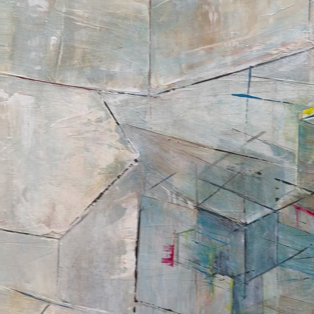 This abstract composition draws inspiration from the layered architecture of San Miguel de Allende’s hillside neighborhoods. Built with over ten layers of acrylic and textured medium, the work reveals a rich interplay of transparency and depth. Architectural fragments emerge and recede, creating an evocative rhythm that mirrors the complex spatial arrangements found in these elevated communities. The textured surfaces suggest lived-in spaces—homes filled with unseen stories. Through its structured ambiguity, the piece conjures the quiet presence of families and their enduring imprint within the built environment.